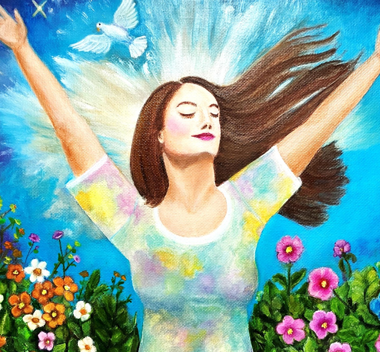 I painted "Praise and Thankfulness" with uplifted arms to serve as a powerful reminder of the transformative power of praise and thankfulness. It's a testament to the fact that in our darkest moments, the act of gratitude can illuminate our path towards healing and growth.